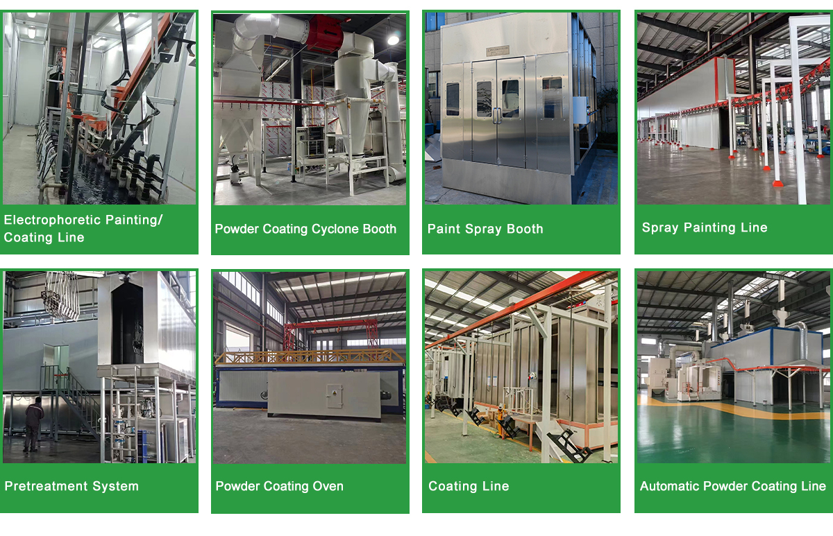 Productos principales:Cabina ciclónica de recubrimiento en polvo, pintura electroforética, cabina ciclónica de recubrimiento en polvo, sistema de pretratamiento, línea de pintura en aerosol